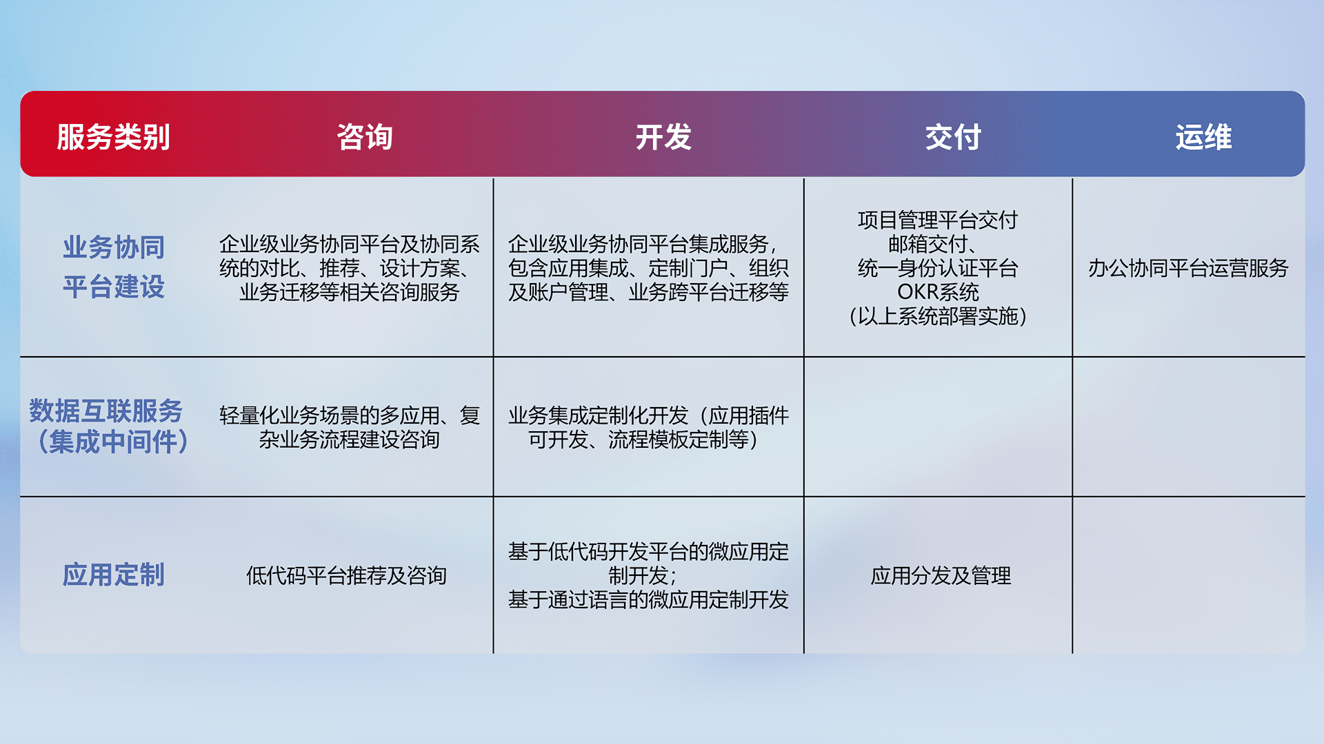 针对钉钉、、、企微、、、、IDaas等平台级产品提供产品的规划、、、、方案、、、交付、、、定制化开发等服务,,,,实现如统一协同办公、、、智能客户服务、、、混合会议管理、、、智能数据查询、、、等业务场景,,,实现数字化转型。。